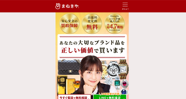 バッグ、時計、貴金属などのブランド品の高価買取に定評がある、人気買取サービスの『まねきや』。