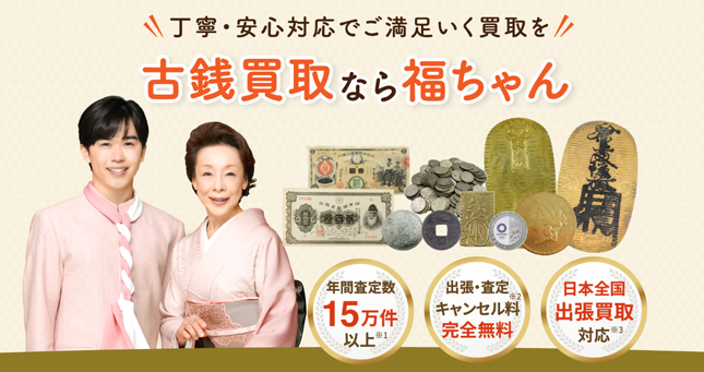 | 特徴 | 累計買取実績800万点突破!鈴木福さんと池波志乃さんのCMでお馴染みの福ちゃん。親切、丁寧、高価買取で定評あり。 | 東証上場企業が運営する大手の古銭買取サービス。最短即日での査定が可能。現金即払い。 | 累計買取実績32万点以上!記念通貨、外国硬貨、古紙幣、大判・小判など、高値で売れた実績多数。 |