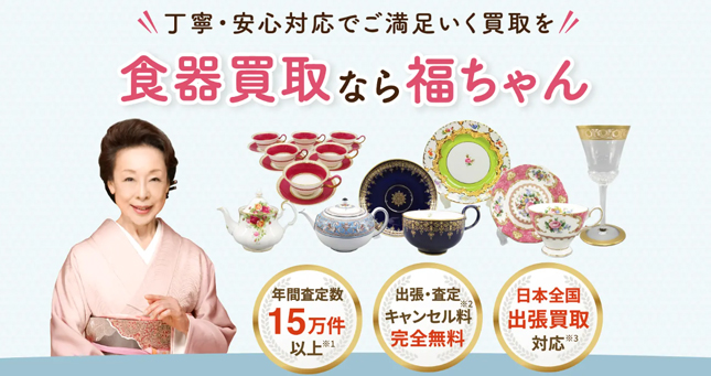 特徴 累計買取実績800万点突破!鈴木福さんと池波志乃さんのCMでお馴染みの福ちゃん。親切、丁寧、高価買取で定評あり。 東証上場企業が運営する大手の買取サービス。最短即日での査定が可能。現金即払い。 専門の査定士が在籍する買取サービス。食器1点だけ、査定だけのご利用もお気軽にOK。